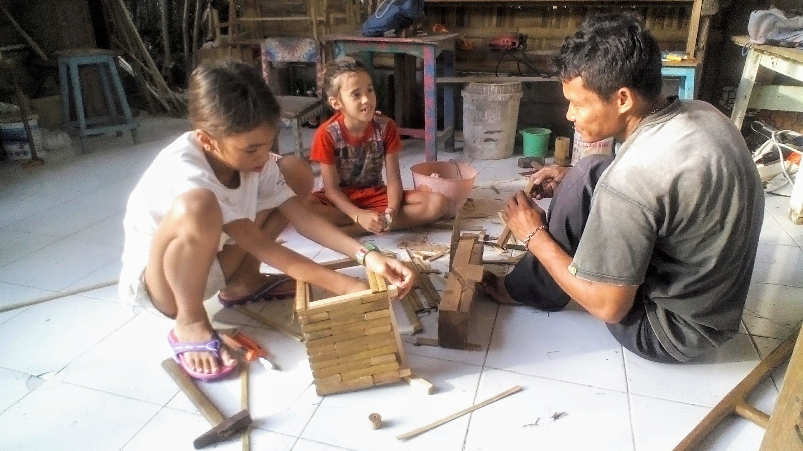 I was first inspired to make kids workshops a few years ago when i first came to Bali and helpX’d at Tasha’s place (Zahara Urban Farm). The neighbouring kids would come over and visit and make craft with Arief (local mastercraftman). My daughter and I had some nice tactile experience working in the cob zone getting muddy.. It felt really lovely having other kids around and to see the look of satisfaction on their faces when they achieved something with their own hands.