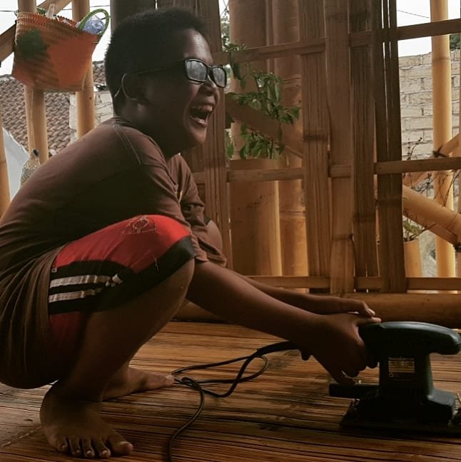 Kadek is a non-conformist 😋 and was being given medication to slow him down a bit. His parents took him off medication totally after they first joined us at the bamboo house and I saw a free spirit unleashed: He has dancing eyes; Love of power tools; Enjoyment at playing catch with coffee sachets and getting me to shoot at our cardboard target across the gangway (street) with a bow and arrow… His laugh is infectious and his avid kidding and ‘annoyances’ kept me perpetually on my toes.