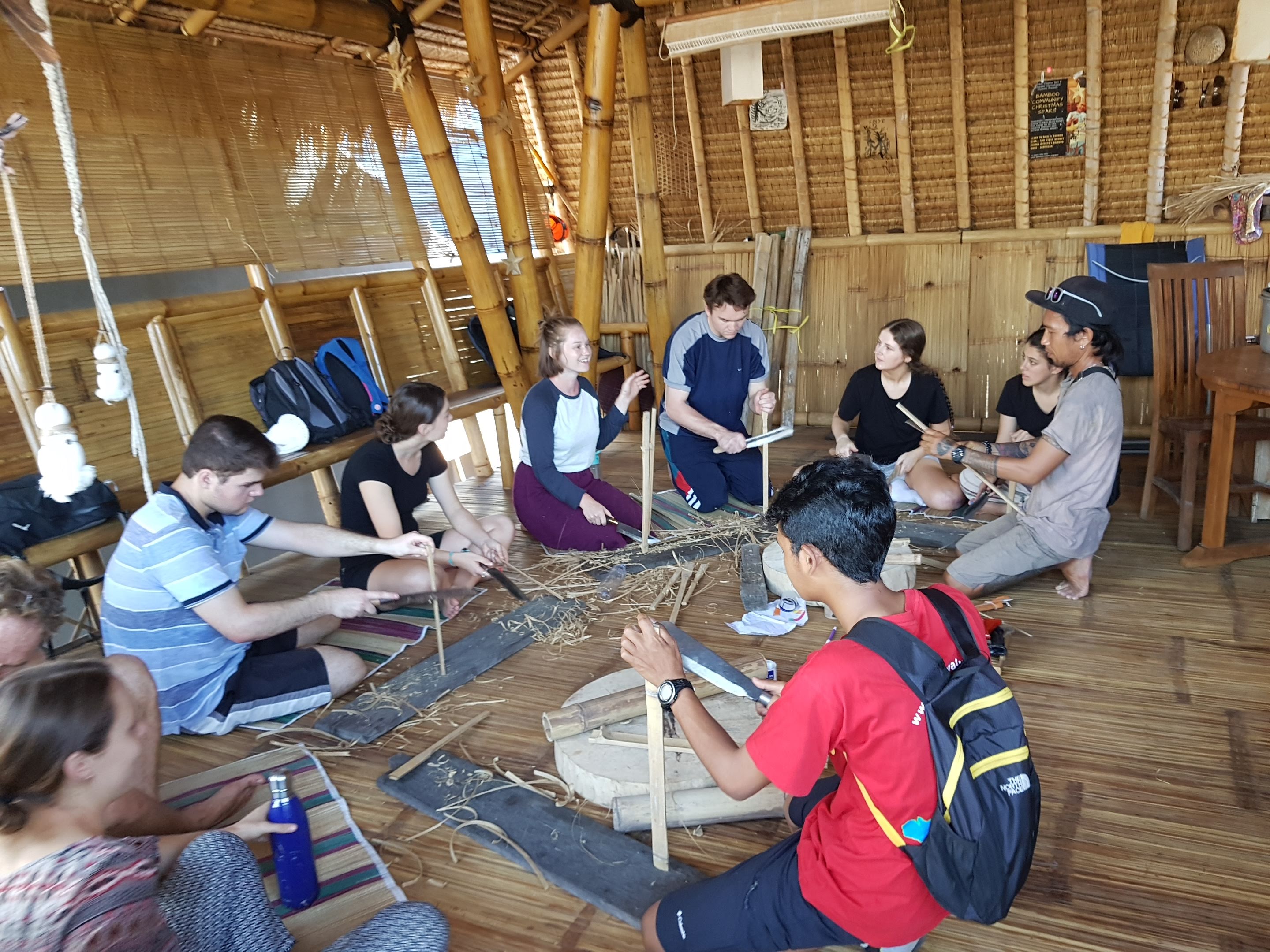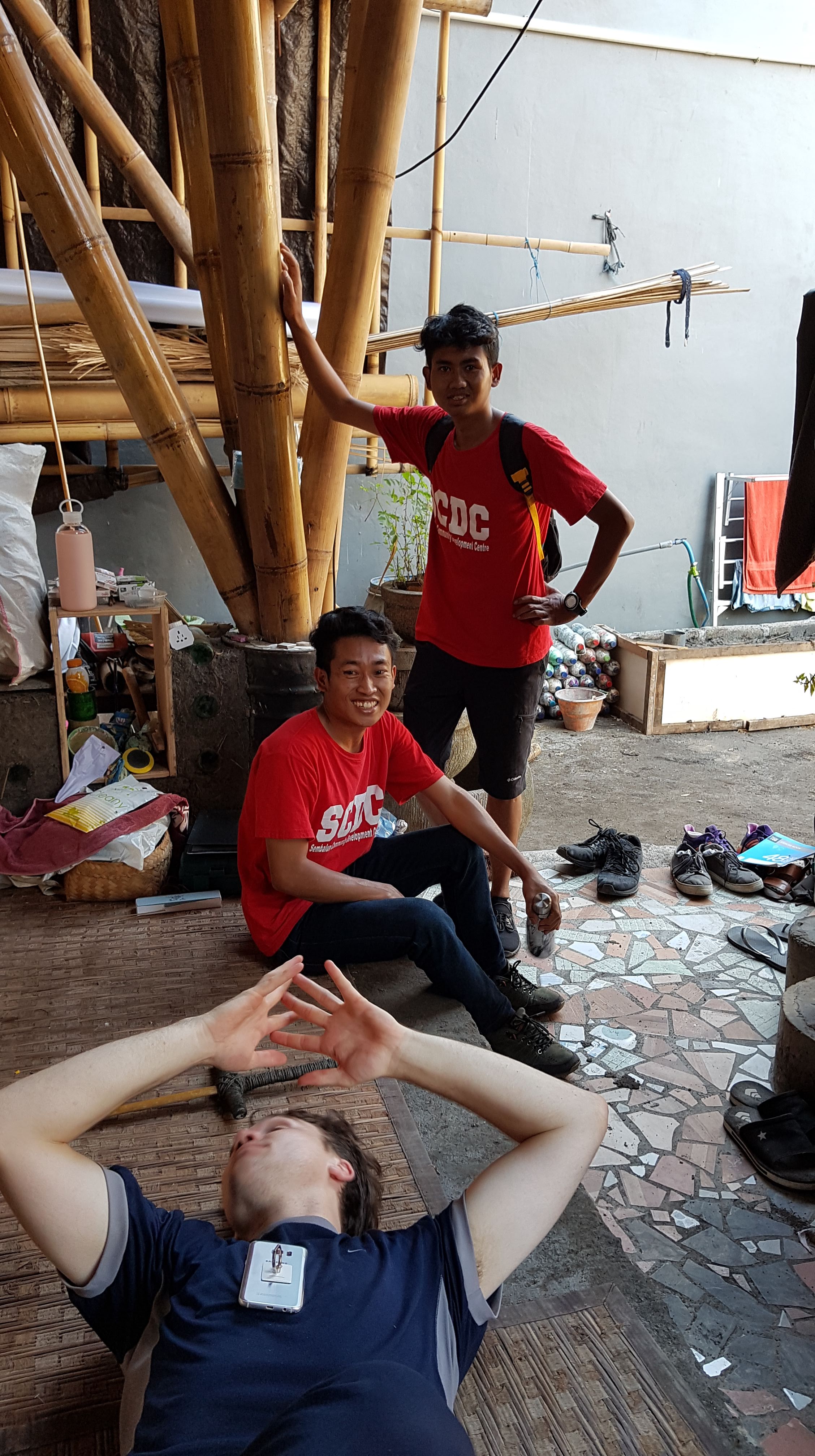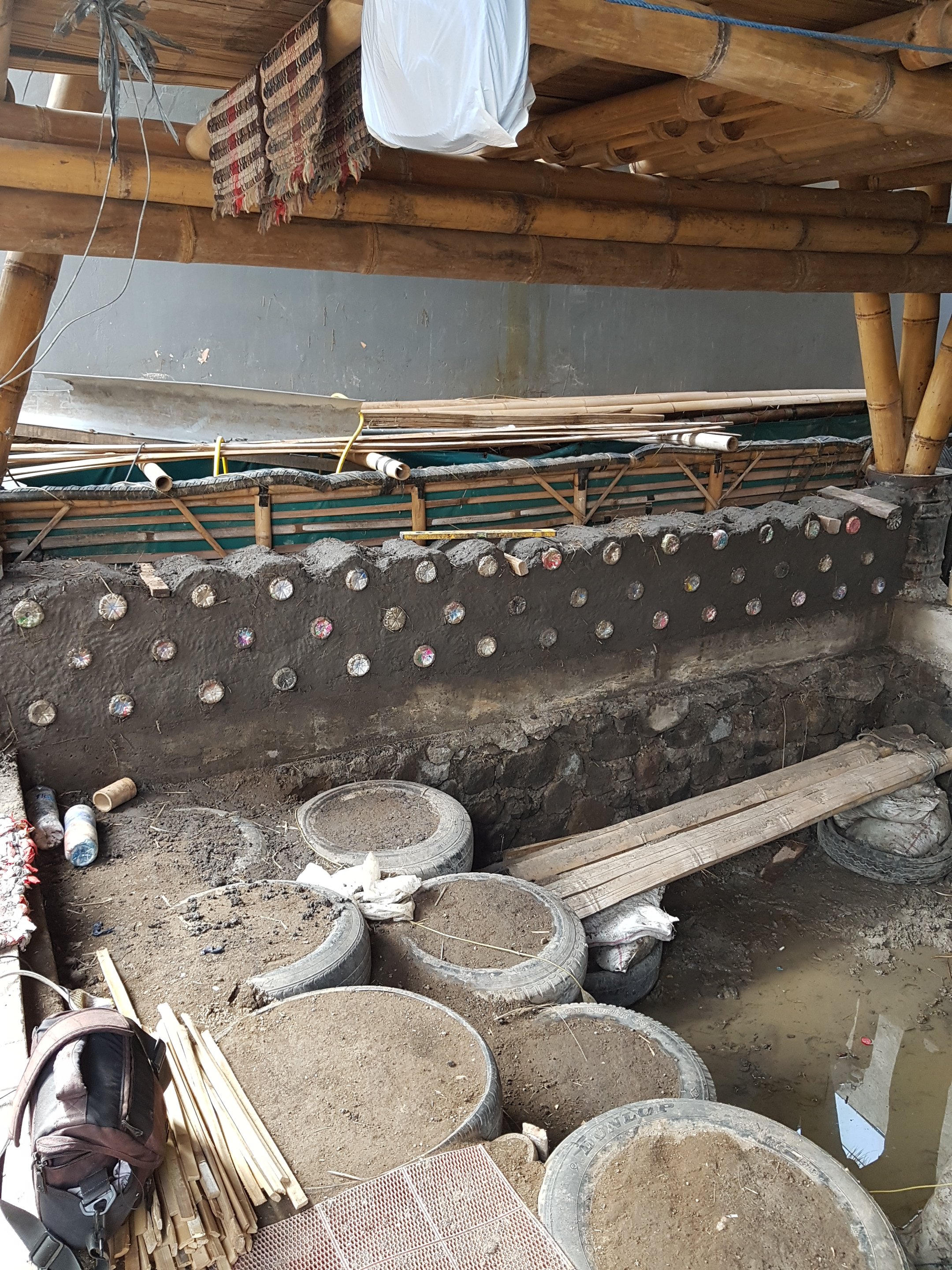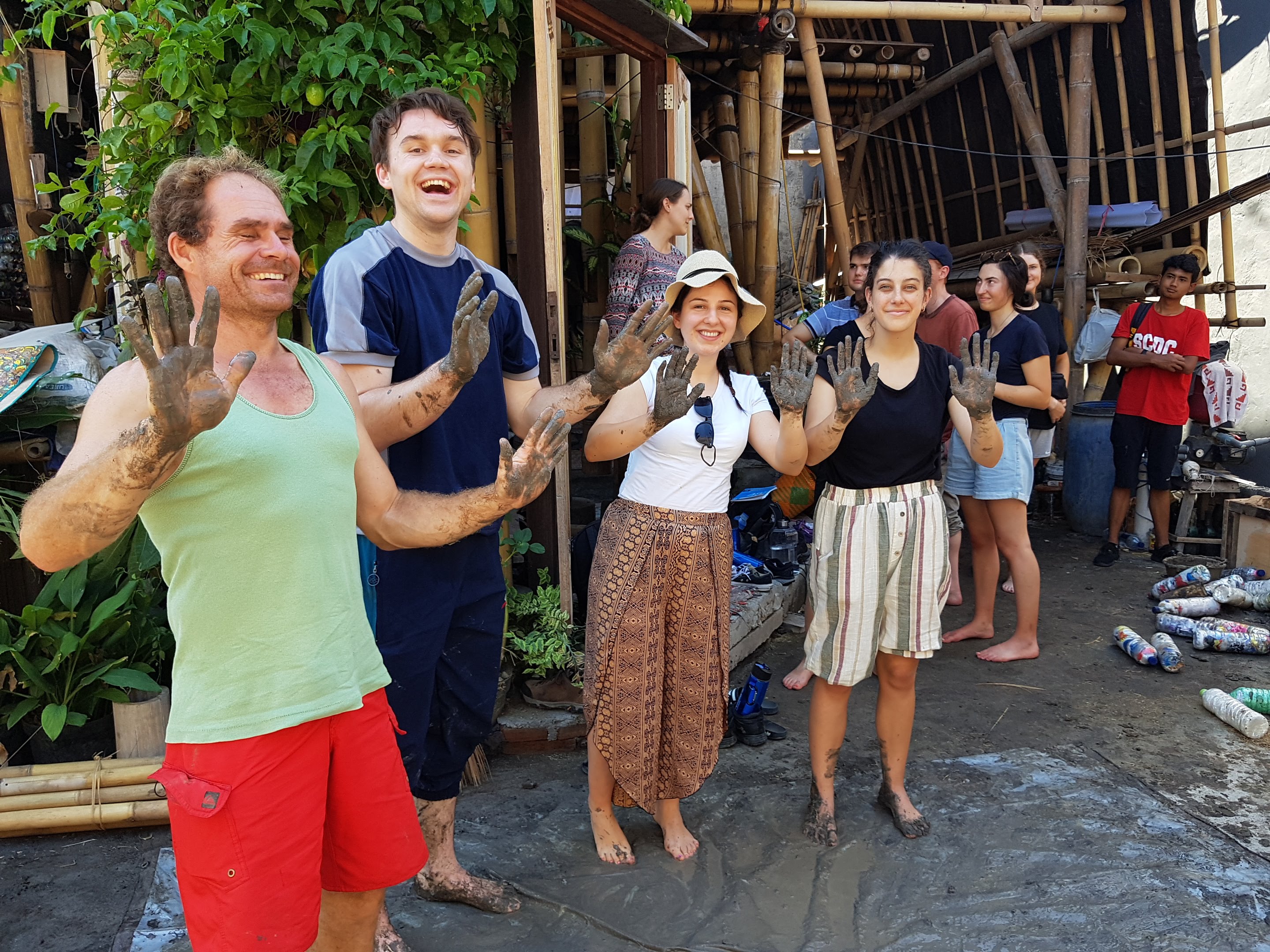 CERES Global also joined us in 2018 from Melbourne for a workshop on making cob, ecobricks and basic bamboo handling and techniques for making this cob-ecobrick bench-seat design. CERES has a sister village Sembalun – Lombok (east of Mount Rinjani) which was devastated by the recent earthquakes and have been supporting the community at Sembalun to pilot their own bamboo-treatment facility and production centre – a fantastic initiative totally in allignement with our own principles of empowering local communities to be able to afford and create their own local industries based on bamboo production and were on their way there to learn more about the local ways and culture and share knowledge together. The participants were all Uni students from diverse faculties and together, we constructed an ecobrick bench seat with cob and rock/sand/cement in the bottom and a bamboo and alang alang (grass thatch) roof to keep it from eroding away in the rainy season. We made a formwork so that the entire bench could be made in one day (usually cob must be done in layers and left to dry so it doesn’t “slump”).