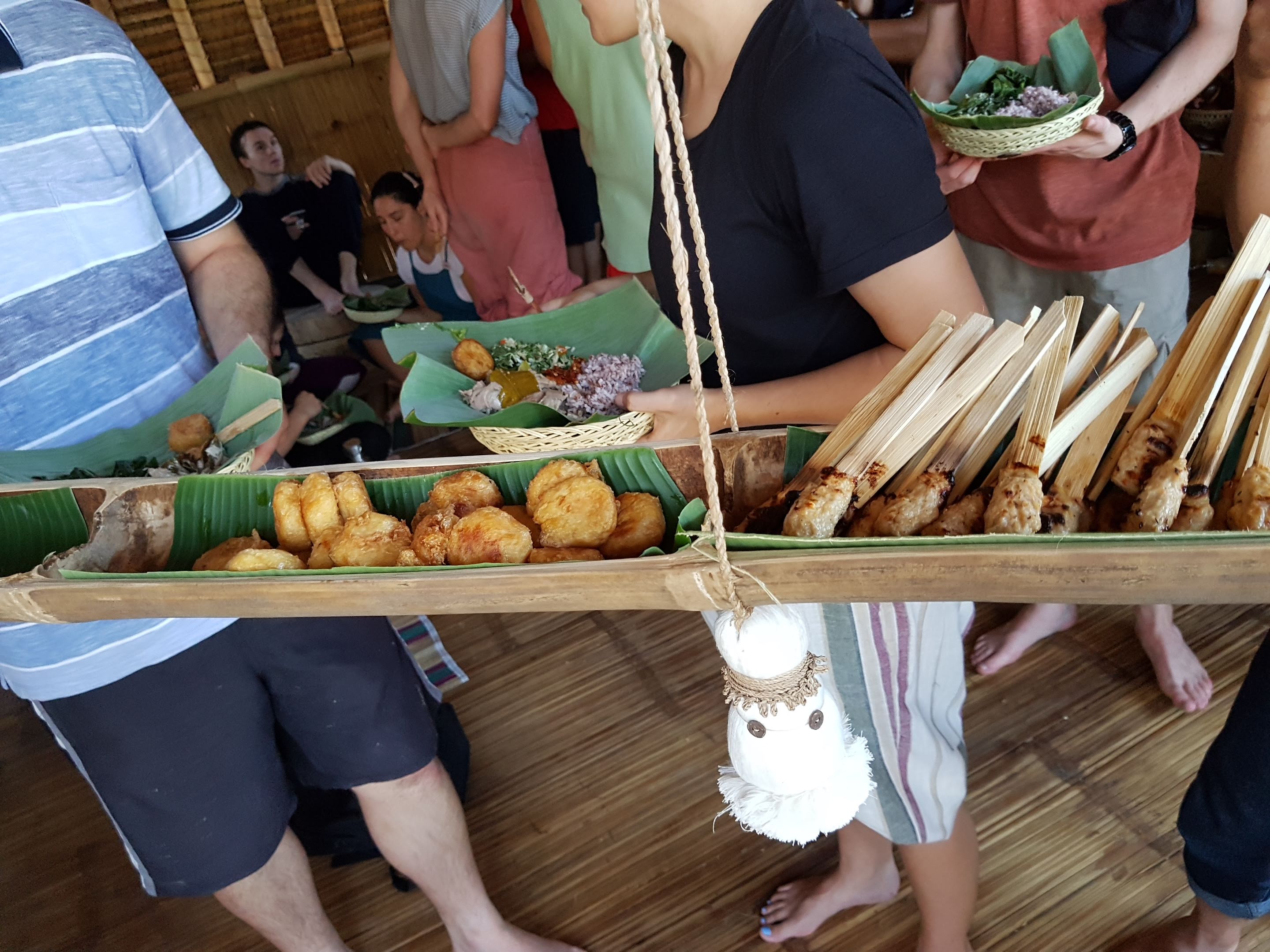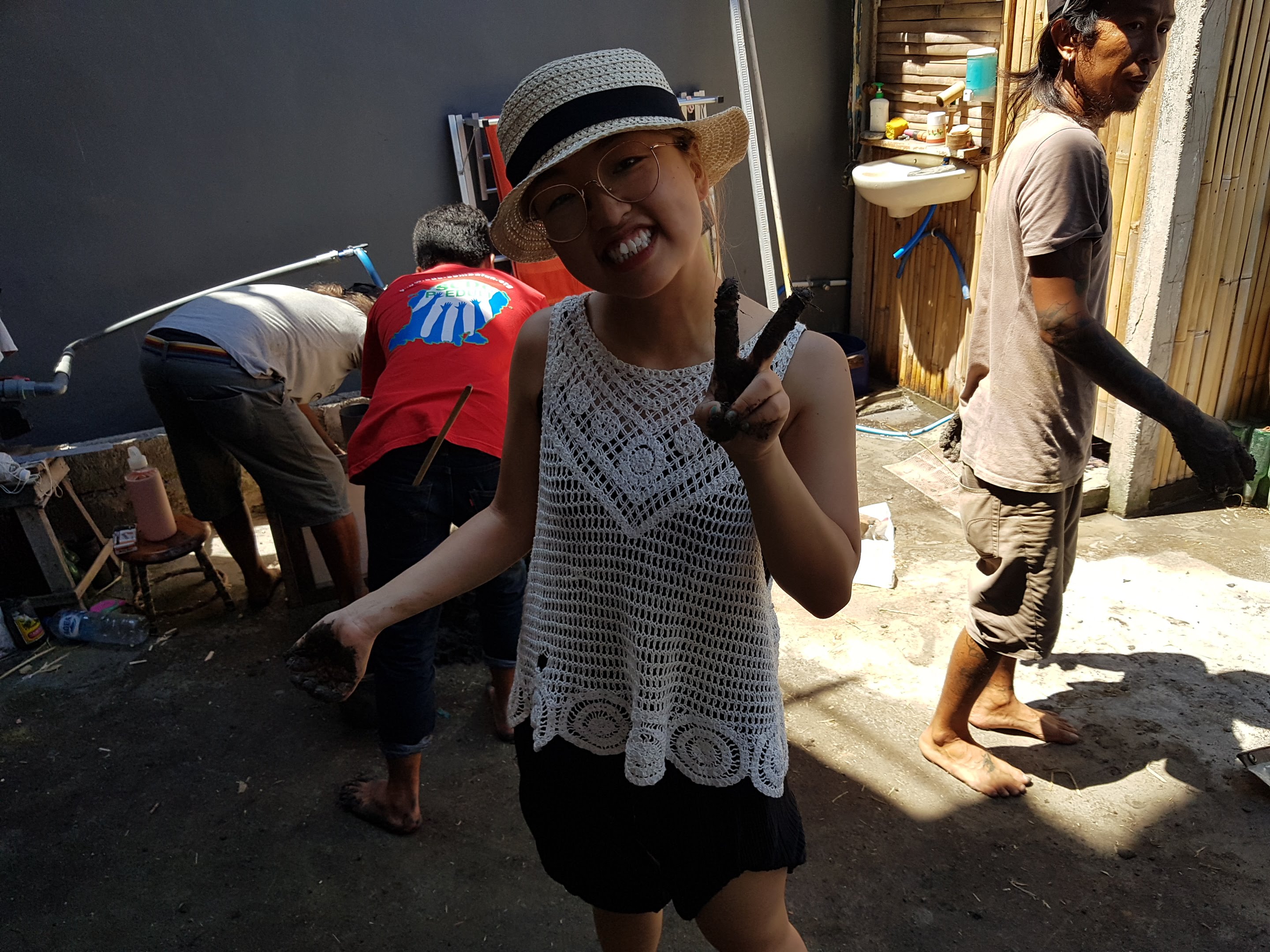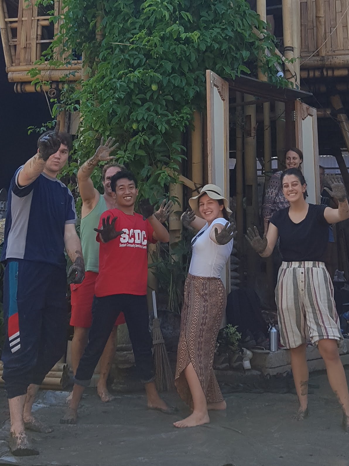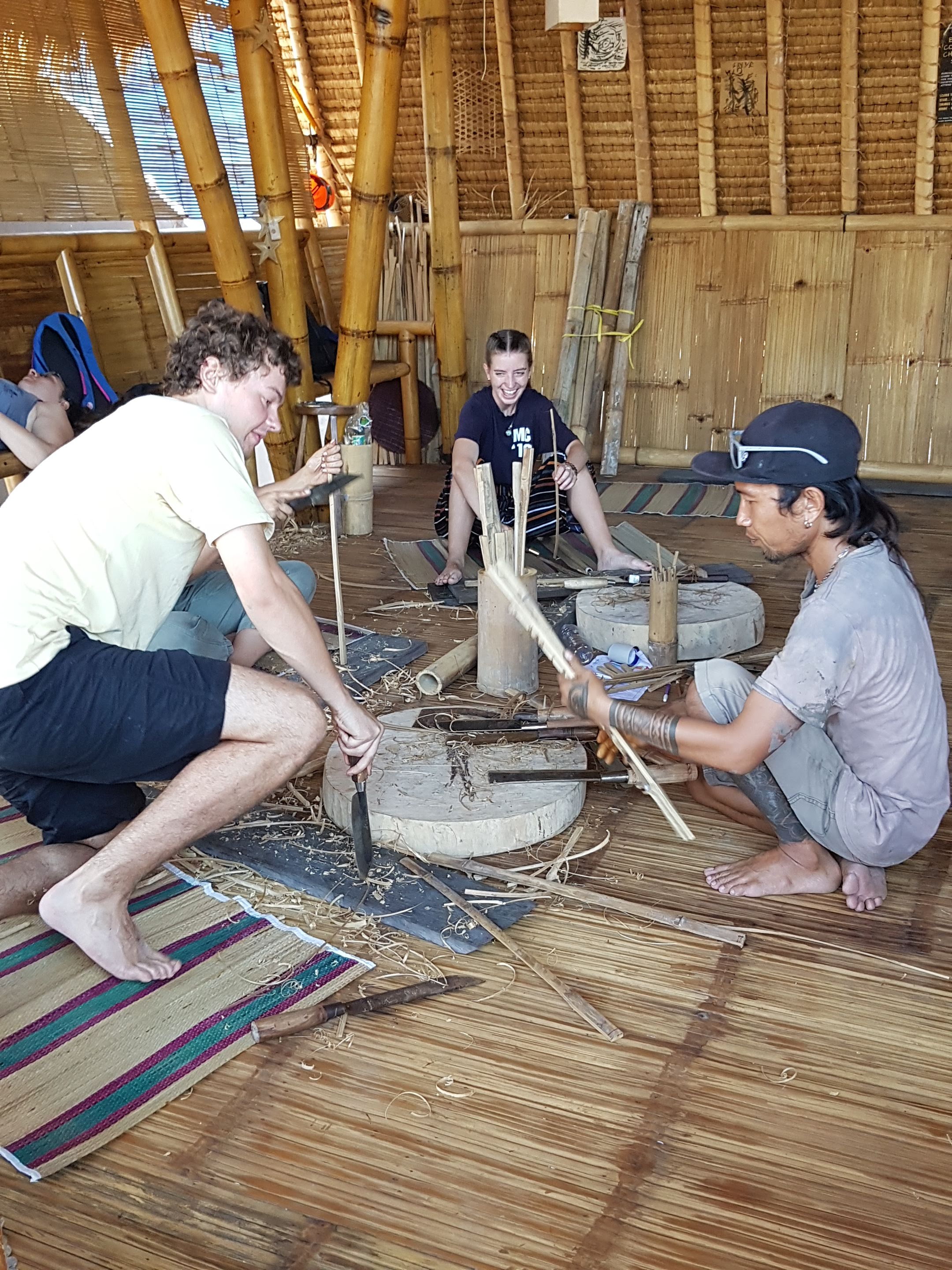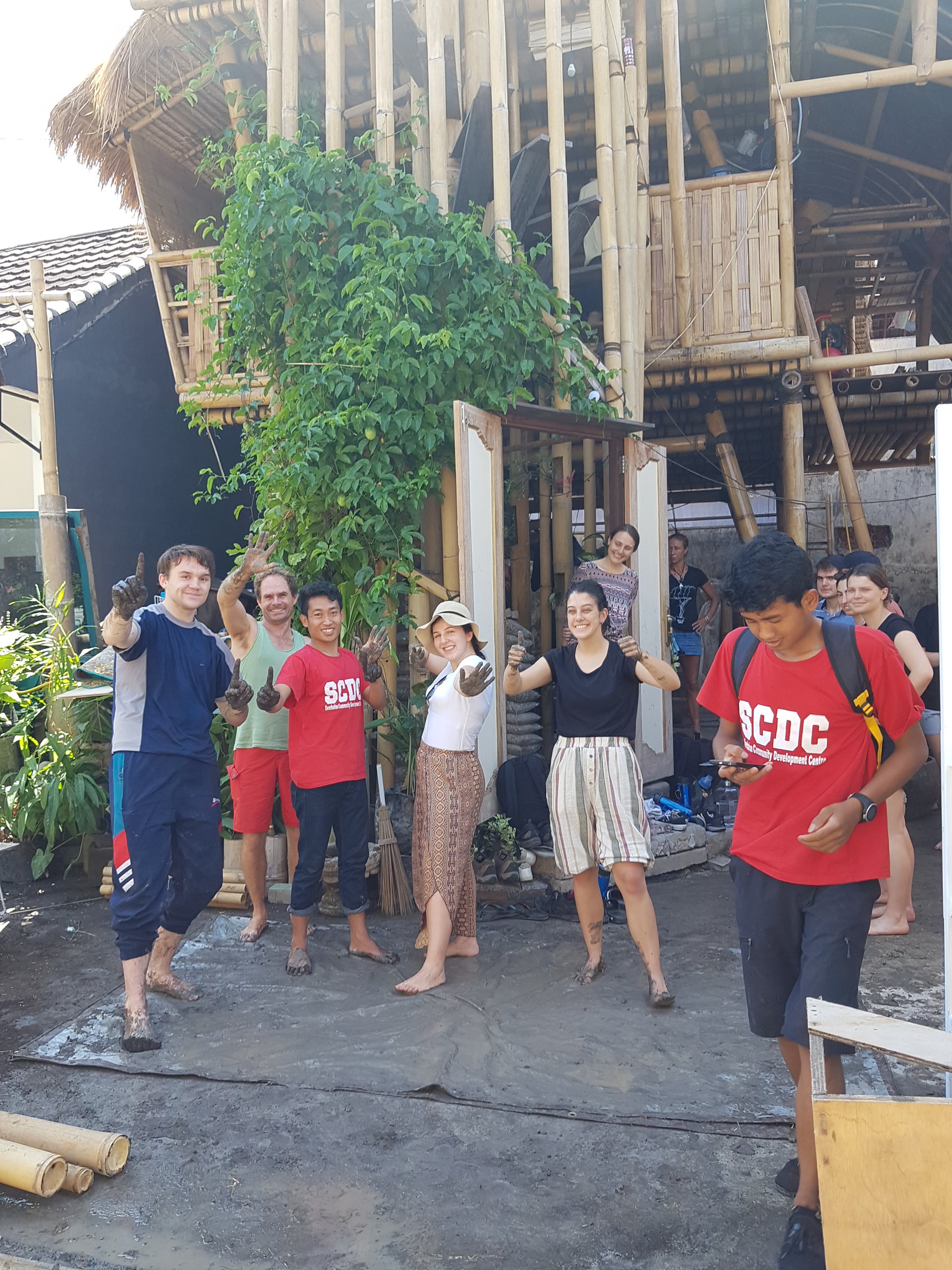 CERES Global also joined us in 2018 from Melbourne for a workshop on making cob, ecobricks and basic bamboo handling and techniques for making this cob-ecobrick bench-seat design. CERES has a sister village Sembalun – Lombok (east of Mount Rinjani) which was devastated by the recent earthquakes and have been supporting the community at Sembalun to pilot their own bamboo-treatment facility and production centre – a fantastic initiative totally in allignement with our own principles of empowering local communities to be able to afford and create their own local industries based on bamboo production and were on their way there to learn more about the local ways and culture and share knowledge together. The participants were all Uni students from diverse faculties and together, we constructed an ecobrick bench seat with cob and rock/sand/cement in the bottom and a bamboo and alang alang (grass thatch) roof to keep it from eroding away in the rainy season. We made a formwork so that the entire bench could be made in one day (usually cob must be done in layers and left to dry so it doesn’t “slump”).