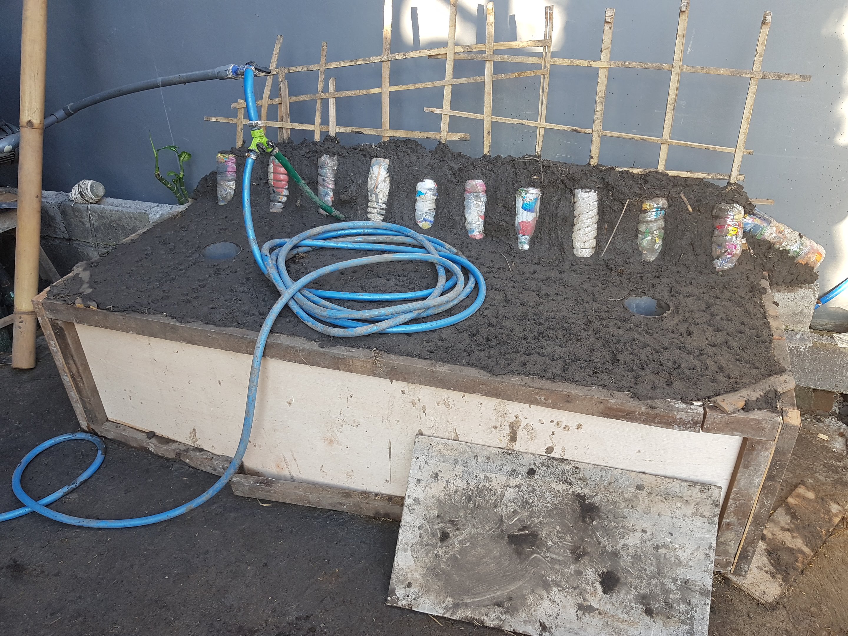 Currently we are experimenting with plastering it and growing grass on top to make a pleasant sitting area to recharge one’s mobile phone/torch with a small solar unit that will be placed on the alang alang (grass) and recycled tetra pack roof when completed. I saw this idea on Youtube and it worked excellently! So here’s the video with the follow-up finishing to where it’s at now.