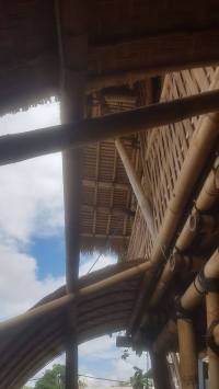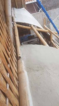 I think it’s a winner. I watched a DVD on Ferros Cement building a while ago and there’s a lot of ri-bar and wire mesh involved. However, because our (this is covering our Eatern-side-roof extension on the house) structure is “self-holding” and really we just want to smear a waterproof shell over it, And because bamboo is so “light” (compared to steel), we just attached a fine gauge galvanised mesh (0.5cm) to the bamboo structure and plastered that baby (not so easy on the near vertical slope that pretty much butts right up to our neighbours’ wall).