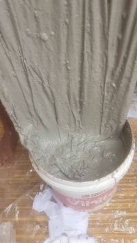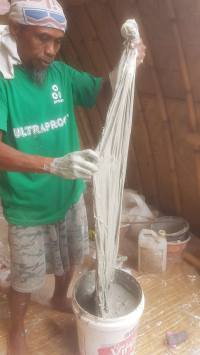 Our previous attempt progressed to mixing calcium and wood glue which wasn’t stable without cement mixed in… We coated it with a waterproofing membrane but – let’s just not go there…. Just get the professionals like this Bapak. Oh yeah, so we mixed in a touch of sand and also “kambing/gamping” – another form of lime which makes water boil when you pour it in there and it strengthens the mix. Our mix: 3 parts mill, 1.5-2 parts cement, 1 part sand, 1/2-1/4 part kambing.