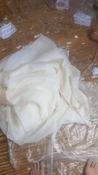 This all came from Supri’s idea a while back to just get old clothes, t-shirts etc, dip them in cement and cover the roof with them. Seeing as I don’t have that many old clothes….. I did buy the fabric. It’s called Paros here. Around 80c/metre AUD. When you look at it up close, it’s like a fine mesh and its quite thin. Hopefully it will hold up – initially I just wanted to stop the cement mix falling through the holes in the bedek – and I could have used something stronger in retrospect… But, the roof is nearly vertical and the plaster mix is calcium, cement and white glue … it was also just a means to get the plaster onto the bedek so we could seal the holes and paint it.