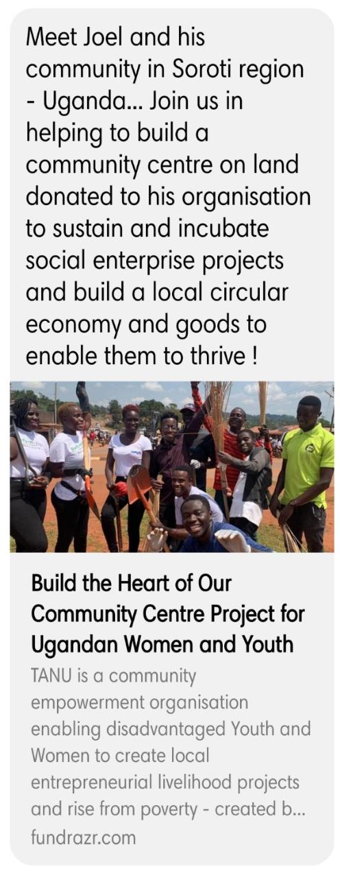 Joel Odongo, founder of TANU in Uganda, aims to build a sustainable Community Centre using bamboo and recycled plastic to support local youth and women in Soroti. Facing hardships, Joel seeks funding for infrastructure and training. The project includes syntropic farming and addressing water scarcity. Support development in Uganda at Fundrazr.com/campaigns/21vv11.