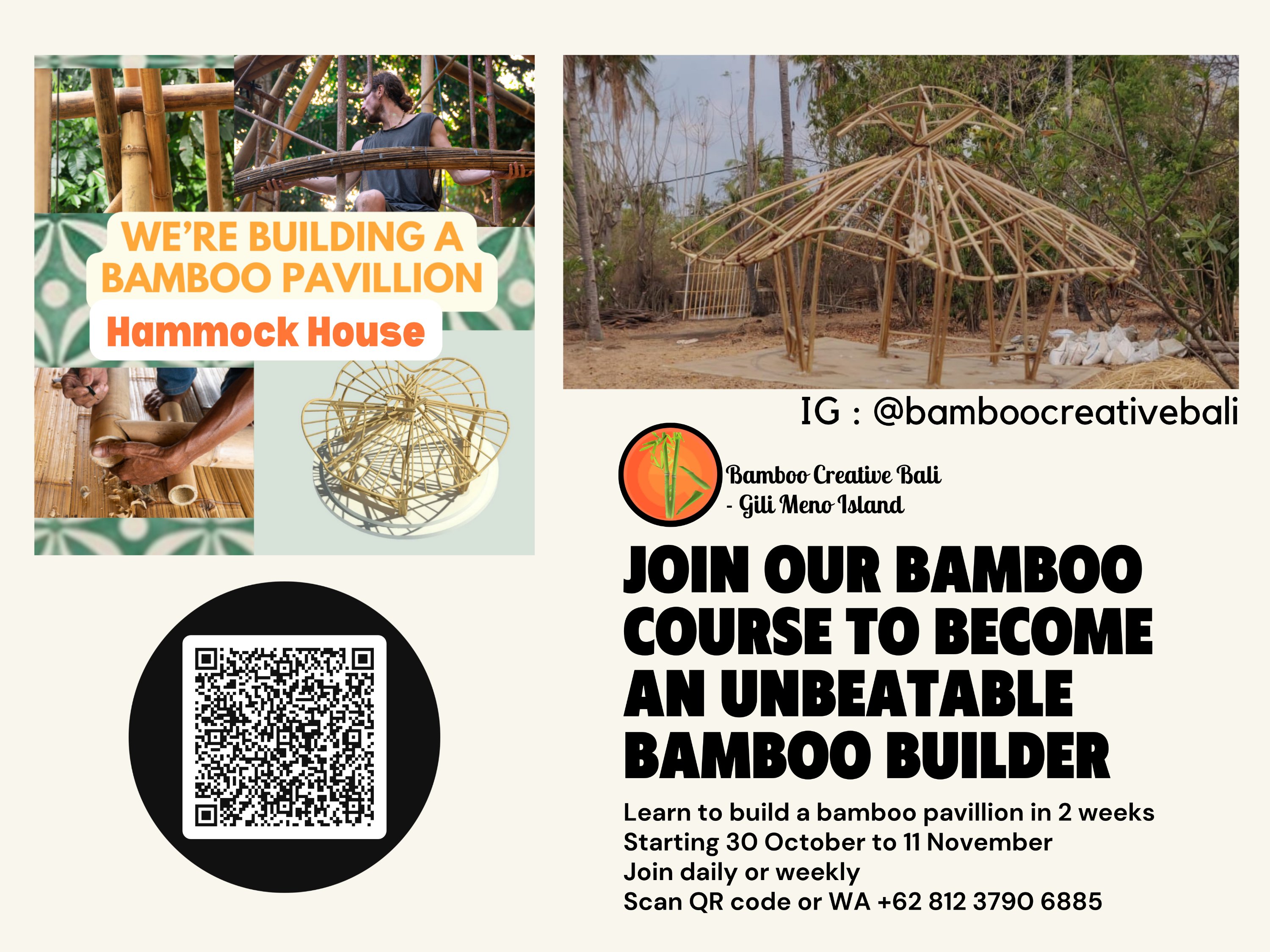 We will be making a reciprocal roof next week with 6 double beams and hinge-jointing them in between two pillars – and once the roof is set we will support the beams with a lean-in pillar, which in turn will be braced with arches (bending bamboo) for triangulation.We will make a lidi beam around 24m long which is a bundled beam that allows for flex and curving shapes. And lastly use recycled advertising banner to complete our roof (after putting woven bamboo and rafters around the undulating roof). Should be prety sweet and we will use this space during our pop-up inclusive retreat for a play space and workshop area. We will be doing mud-building also to make some sculpture æaround the walls and try out something arty…