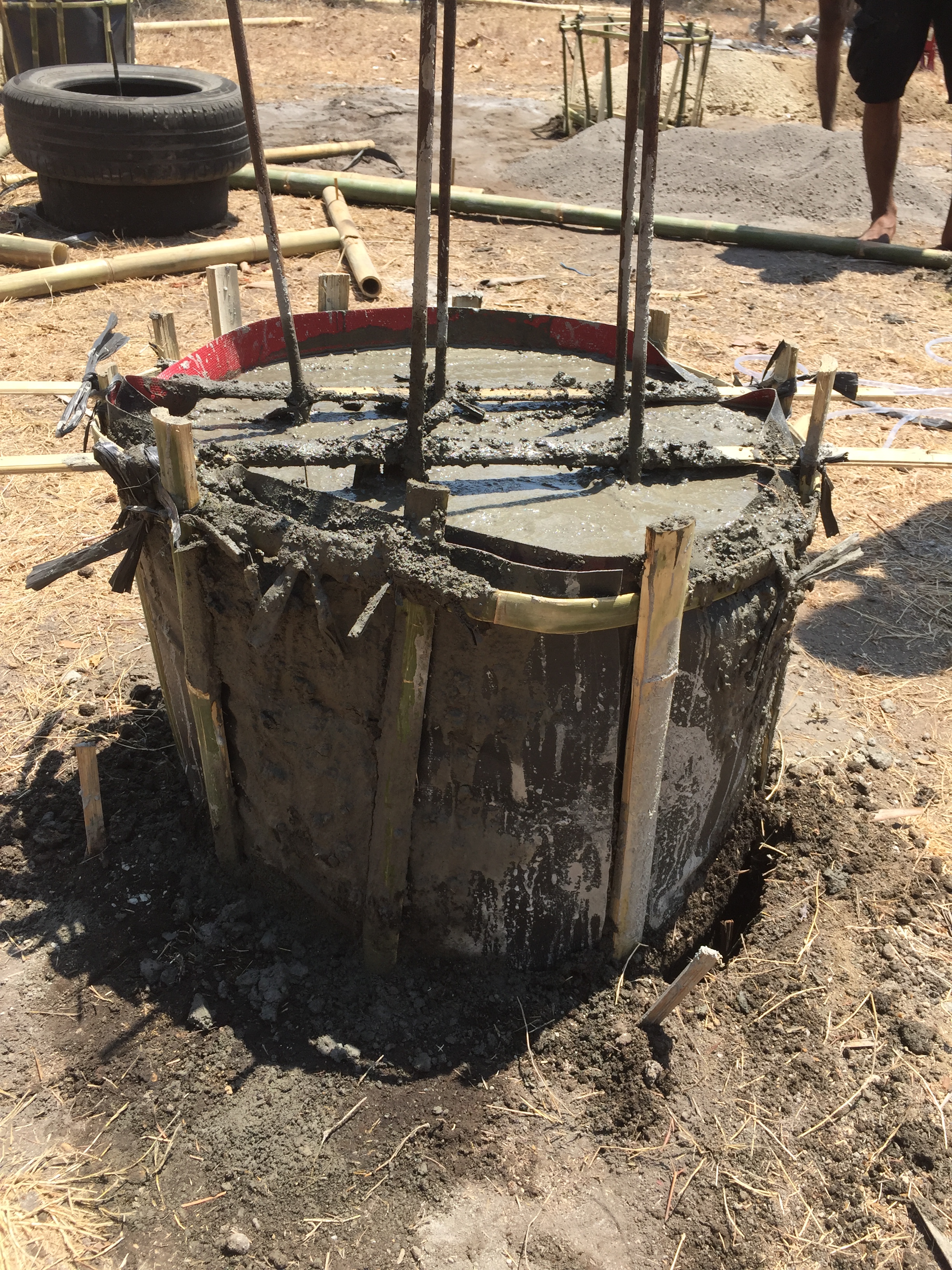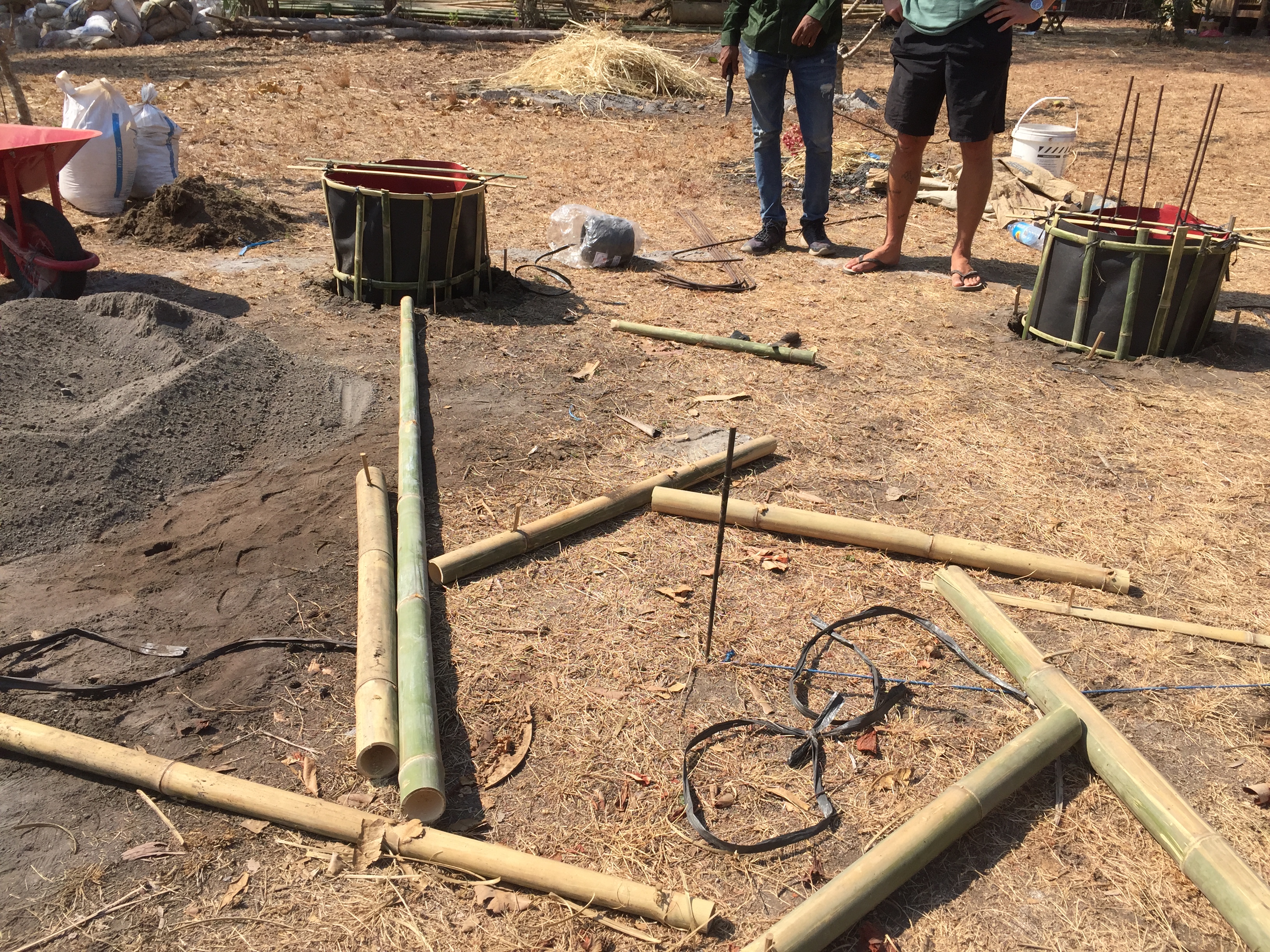 The main reason people in developing countries dont want to build with bamboo is that it doesn’t seem to last long – as insects attack it and devour its sugars usually within 2 to 5 years if left untreated. And treatment methods are expensive and hard to set up – especially if you live in a village. Also most people put bamboos on or near the ground which is a sure fast way to having it rot away quickly once moisture gets in to the bamboo. And even materials to do formwork can be expensive… so, why not make a bamboo formwork basket and line it with plastic waterproofing and pour that with cement and rocks? Thats what we are trying out for this build where we will build a 6.5 m pavilion designed by our group project students Charlotte and Mari… with a bit of inspo thrown in by yours truly.
