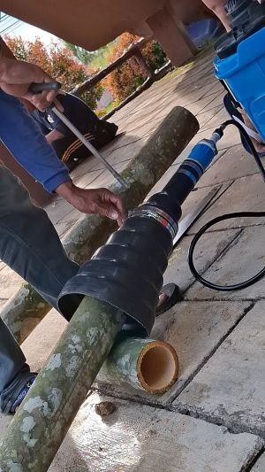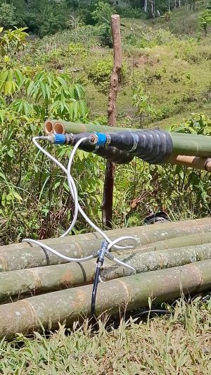 One of the things I’m learning from our Filipino partner organisation, Evergreen Kawayan is how to how they run their Boucherie treatment setup. The rubber hose fittings they use to pressurise the borax solution through the culms make it much faster and easier to switch poles and adapt to differeing size bamboos.