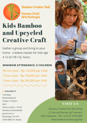Kami menawarkan kegiatan lokakarya bagi anak-anak anda untuk belajar kerajinan dan kegiatan kreatifitas yang terbuat dari bambu , dimana kami akan mengadakan beberapa kelas pada hari Sealaska dan hari Jumat pada setiap minggu. Untuk anak-anak kecil (usia 4-8 tahun) , kelas akan kami adakan pada pagi hari mulai pukul 09.30 pagi -12.00 siang, sedangkan untuk anak-anak yang lebih besar (usia 8-12 tahun) , kelas akan kami adakan pada sore hari mulai pukul 1.00 siang – 15.30 sore. Mohon dapat menginformasikan kepada kami terkait dengan usia serta minat anak-anak anda , sehingga kami dapat menempatkan anak-anak anda sesuai dengan kegiatan di kelas yang kami adakan.